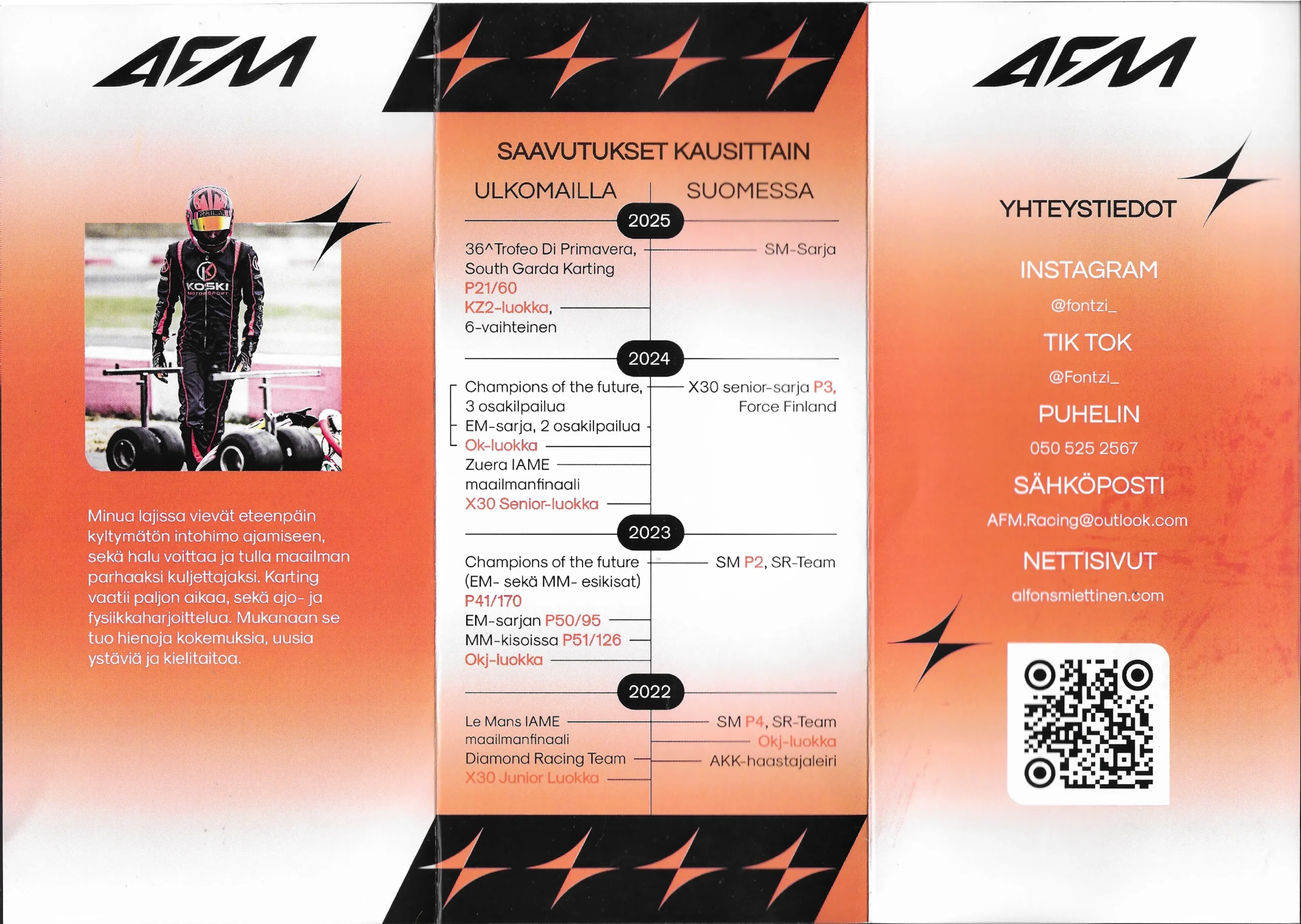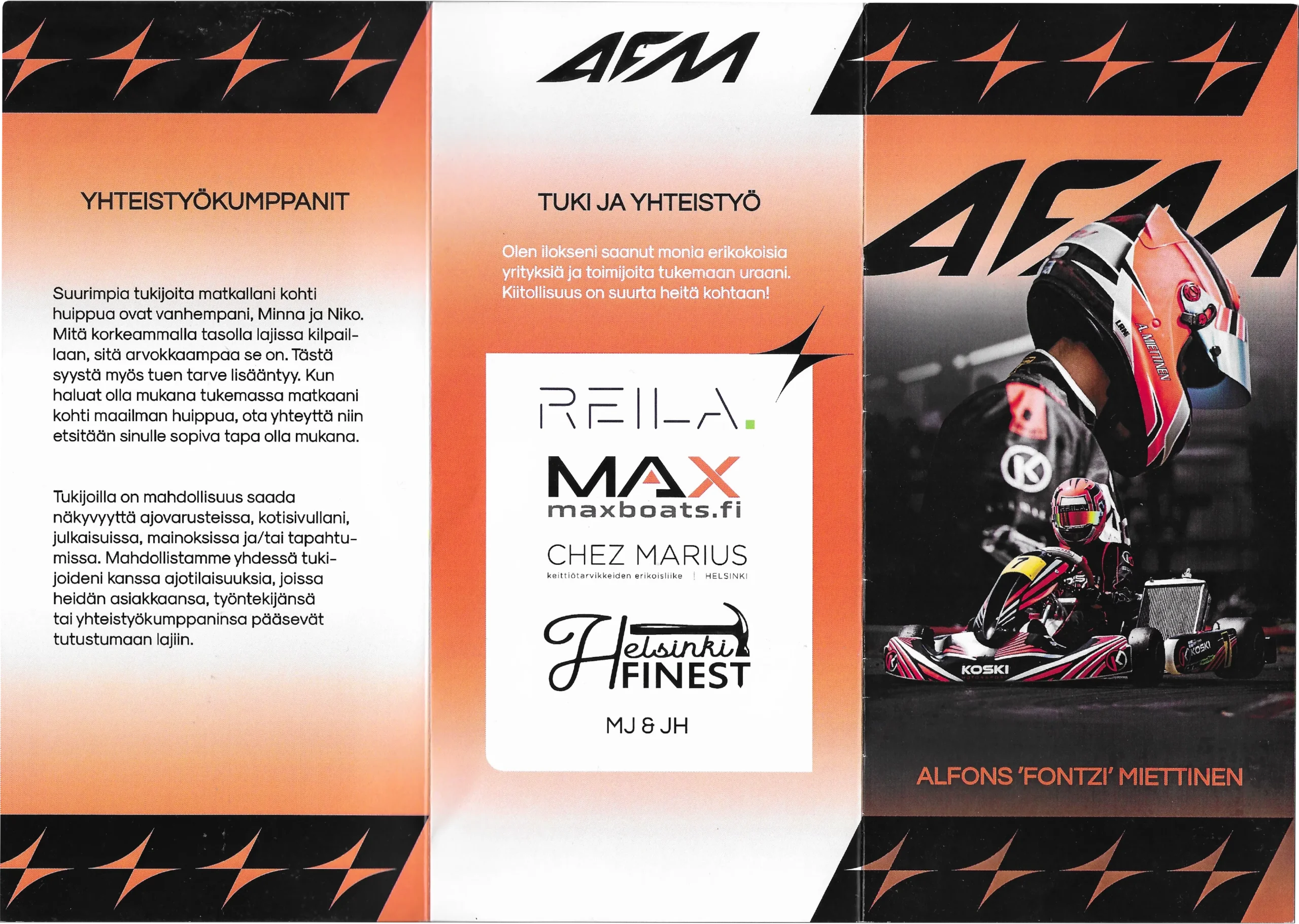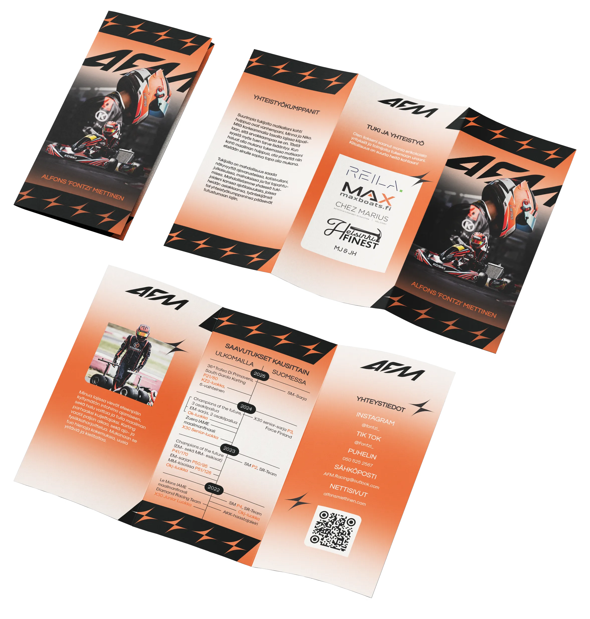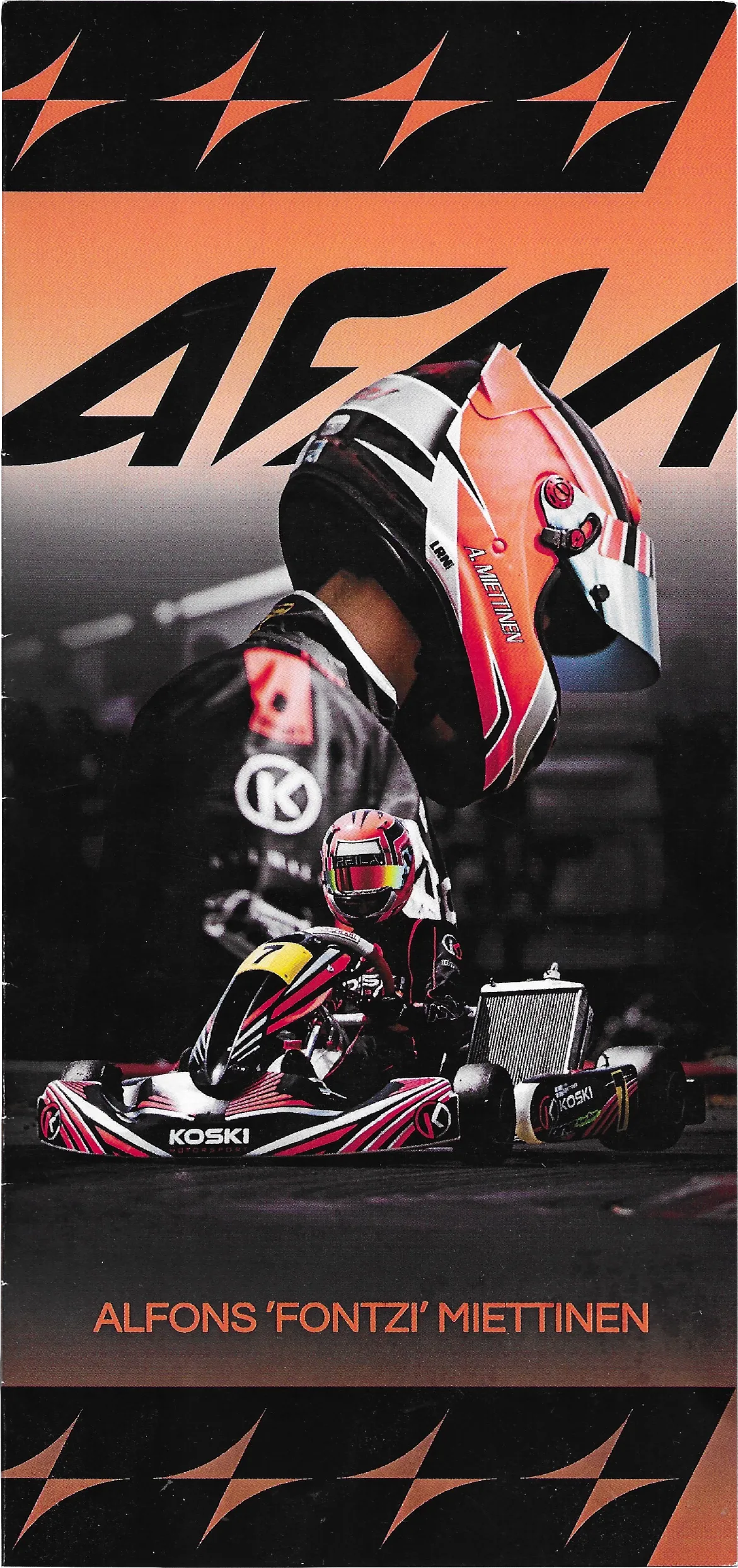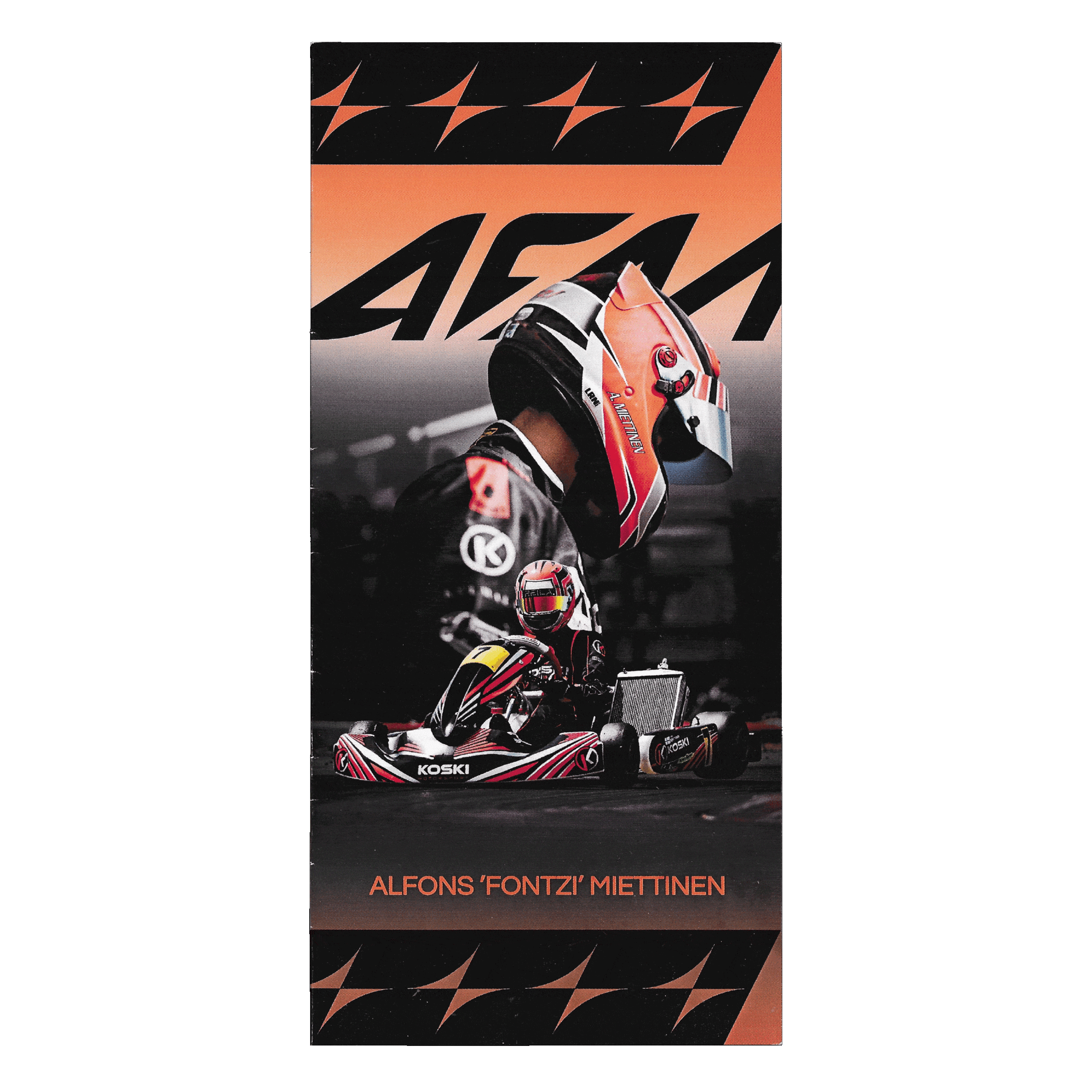 Yhteistyömme sai alkunsa tarpeesta luoda esite, jonka avulla mahdolliset karting-tallit, tukijat ja yhteistyökumppanit voisivat helposti tutustua Fontzin saavutuksiin ja toimintatapoihin kilpailujen yhteydessä. Tämän tueksi suunnittelin kuskille myös visuaalisen identiteetin ja brändin.